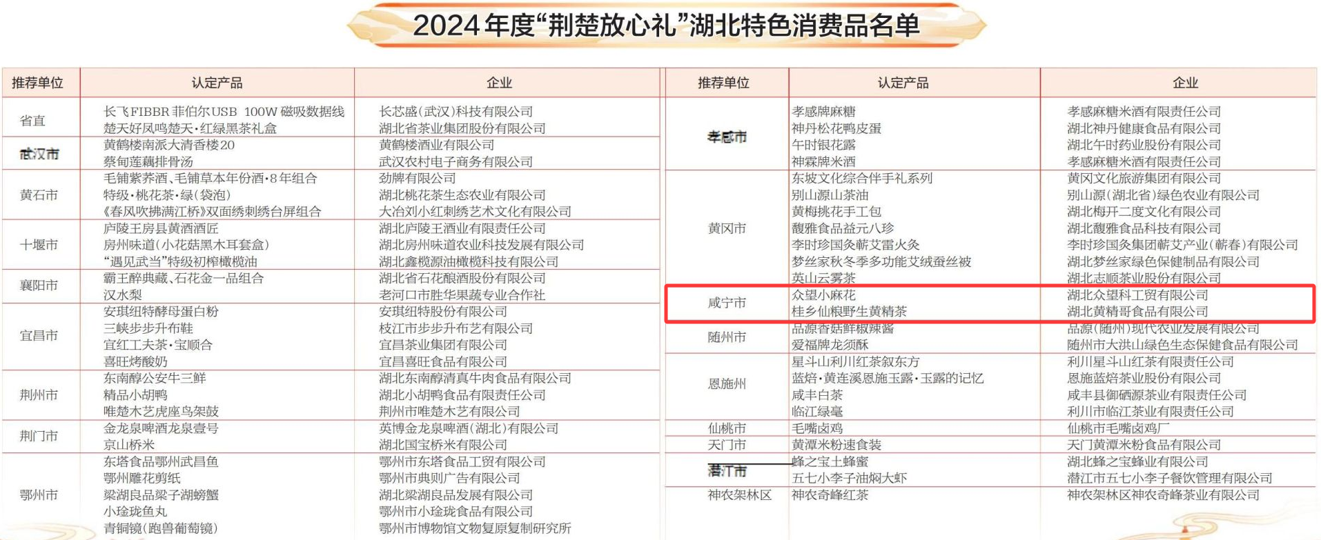 咸寧市有2款產(chǎn)品眾望小麻花、桂鄉(xiāng)仙糧野生黃精茶入選2024年度“荊楚放心禮”湖北特色消費(fèi)品。